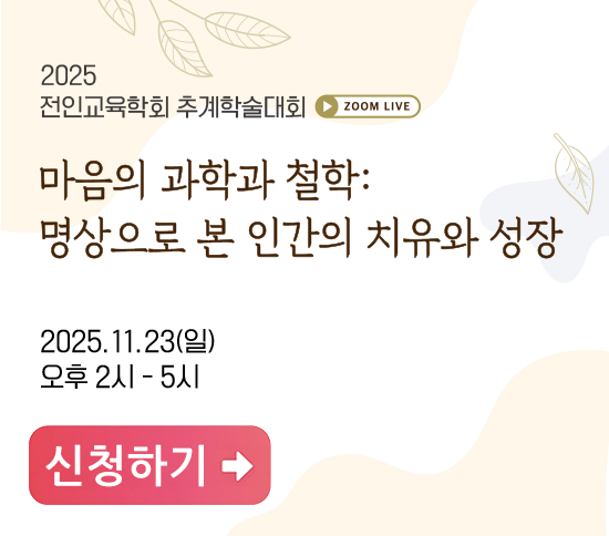 2025.11.23(일) 14:00 ~ 17:00 사전등록신청은 꼭 부탁드립니다. 학술대회 사전등록 신청참가비: 회원 무료, 비회원 3만원문의: 041-736-9100office@humancompletion.org zoom 프로그램 접속이 가능한 조용한 공간